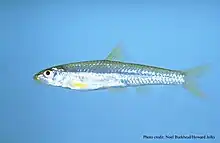 The back and sides above the lateral line are pale yellow, with a dusky cross-hatched pattern and a thin, but noticeable, middorsal stripe. The lower sides and ventral side is typically silvery or silvery white. Though usually obscure or absent, some fish may have a faint lateral stripe, especially on the caudal peduncle; pigment of the lateral stipe is confined to the areas above the lateral-line. There is no concentration of melanophores at the base of the caudal fin and all fins lack dark pigment. The fins of breeding individuals, particularly males, have a bright lemon yellow pigment. Males may also have yellow snouts.[3]