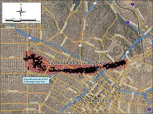 ![]() The Los Angeles City Oil Field in the Los Angeles Basin of southern California. Other oil fields are shown in light gray. | |