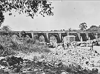 A bridge was built over this river during the Spanish Colony, thanks to the initiative of Baltazar de Orena[Note 1] from Valle Town Hall and governor Pedro Mayen de la Rueda, who proposed its construction in 1579. The bridge was completed in 1592 under the director of architects Francisco Tirado and Diego Felipe.[4] Years later, some repair were needed, and criollo poet and leader Francisco Antonio de Fuentes y Guzmán was in charge of the work.[4][Note 2]
