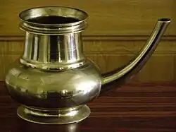 A lota (Hindi: लोटा; Odia: ଲୋଟା/ନୋଟା; Urdu: لوٹا) is a small, spouted, and rounded vessel that has been used in the Indian subcontinent[1] since the 2nd millennium BCE or earlier.[2] The design itself serves multiple purposes; a copper lota is commonly used in Indian religious ceremonies, such as yajna during puja, for wedding rituals, and other sacred traditions. It is also used for serving water and liquor.[3][4] According to the ancient Indian/Hindu-origin traditional medicine system of ayurveda, drinking water stored in the copper lota has health and nutritional benefits.[5]