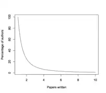 Lotka's law,[1] named after Alfred J. Lotka, is one of a variety of special applications of Zipf's law. It describes the frequency of publication by authors in any given field. Let X be the number of publications, be the number of authors with publications, and be a constants depending on the specific field. Lotka's law states that .