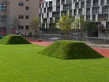 Eight grass pyramids in the lawn reveal aspects of the local history. They form the quasi pro-turbances of the conspicuous lawn funnels of the former ammunition huts. The park’s patchwork is complemented with a band of play equipment for toddlers, a blue sports pitch for ball games and a timber stage.[3]