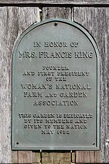 In 1914, she helped to found the Women's National Agricultural and Horticultural Association, which two years later changed its name to the Woman's National Farm & Garden Association (WNF&GA). King, who served as the first president of the WNF&GA from 1914 to 1921, saw horticulture and gardening as a means for women to establish themselves in the world; under her guidance, the WNF&GA established scholarships for women to pursue academic study of agriculture, botany, and landscape architecture.[3][6][7][2][10] During World War I, the WNF&GA and GCA helped organize the Woman's Land Army of America: 15,000 so-called "farmerettes" worked in agriculture, replacing men called into military service.[3] For her role in these efforts, King was awarded the National War Garden Commission’s bronze medal.[3]