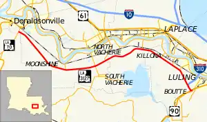 Louisiana Highway 3127 (LA 3127) is a state highway in Louisiana that serves Ascension, St. James, St. John the Baptist, and St. Charles Parishes. It spans 42.1 miles (67.8 km) in a northwest to southeast direction.[1] It parallels LA 18 along the west bank of the Mississippi River, providing a much shorter inland bypass of the River Road. It is bannered in all four cardinal directions depending upon the part of the route.