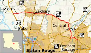 From the west, LA 64 begins at the intersection of LA 964 (Old Scenic Highway) and Mt. Pleasant–Zachary Road, both of which lead to US 61 and the city of Baton Rouge. LA 64 heads east through the East Baton Rouge Parish city of Zachary on Church Street, a divided four-lane thoroughfare, and passes several residential subdivisions. Just before the highway passes the local high school, the median is discontinued as the roadway narrows. LA 64 becomes a commercial corridor as the route curves southeast onto High Street then east again across the Canadian National Railway (CN) line onto Main Street.[3][4][5]