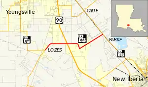 From the west, LA 88 begins at an intersection with LA 89 located at a point in northwestern Iberia Parish known as Lozes. LA 89, heading north from Delcambre, makes a sharp turn from Coteau Road west onto Youngsville Road to head toward the small city of Youngsville. LA 88 proceeds straight ahead on Coteau Road for 0.6 miles (0.97 km) then curves to the east. After 1.3 miles (2.1 km), LA 88 passes through an interchange with US 90, the future route of I-49, which connects to Lafayette on the northwest and Morgan City on the southeast.[2][3][4]