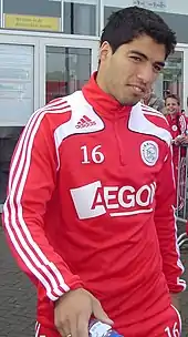 Suárez (with the Ajax pennant) as Ajax captain in 2010. Suárez was named captain in the 2009–10 season.