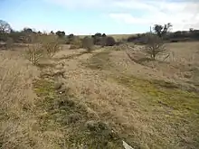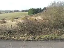 As a result of the war and the failure of the airport to materialise, Lullingstone station was never brought into use and gradually became derelict.[11][18][19] The introduction of the post-war Green Belt Act put a halt to any potential residential development and the incomplete station, standing in the middle of fields, was useless.[20][2][17] It was mostly dismantled in 1955, leaving only the concrete supports for the platforms.[21][17] The station canopy was removed and re-erected in 1960 at Canterbury East.[20]