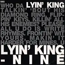 "Lyin' King" is the first single released from Nine's second album, Cloud 9. It was released on July 23, 1996 and was produced by Rob Lewis. "Lyin' King" was Nine's final charting single, making it to three different Billboard charts, including 35 on the Hot Rap Singles. The song is an indirect diss aimed at rappers who were trying to capitalize on the popular Mafioso rap at the time.
