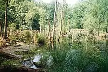 Liselund Park, at the northern end of the cliffs, is an attractive combination of small houses, ponds and rolling lawns built by Antoine de la Calmette for his wife Elisabeth or Lise at the end of the 18th century.[8]