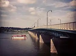 The M. Harvey Taylor Bridge is a steel girder multilane highway bridge that spans the Susquehanna River at Harrisburg, the state capital. It connects central Harrisburg with the near suburbs on the West Shore.  Built in the early 1950s, it was reconstructed and widened in 2001-04 to accommodate additional pedestrian walkways. The speed limit is 50 miles per hour (80 km/h).  The Average Daily Traffic in 2016 was 28,139, only 2% of which was trucks.  The bridge has never had a route designation.