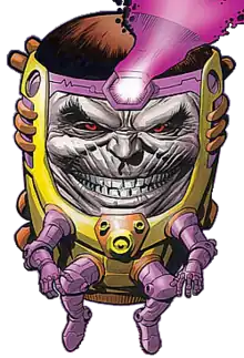 George Tarleton was a technician for the criminal organization Advanced Idea Mechanics (A.I.M.), founded by his father Alvin.[5] He was born in Bangor, Maine. Having recently created the Cosmic Cube, the A.I.M. scientists used advanced mutagenics to alter Tarleton and created the super-intelligent man-mind originally named MODOC (an acronym for Mental Organism Designed Only for Computing) to study and improve upon the object, alongside the JOD1E program.[5] MODOC, however, becomes ambitious, kills his creators and takes control of A.I.M. Renaming himself MODOK (an acronym for Mental Organism Designed Only for Killing), he comes into conflict with the hero Captain America, who is intent on rescuing S.H.I.E.L.D. agent Sharon Carter from A.I.M.[6][7] MODOK becomes a recurring foe for Captain America, battling the hero on three more occasions, with the third and last encounter revealing the villain's origin.[8] MODOK also battles Namor the Sub-Mariner and Doctor Doom, the latter intent on claiming the Cosmic Cube for himself.[9] MODOK reappears and abducts Betty Ross, changing her into the Harpy with gamma radiation at a higher level than that which turned Dr. Robert Bruce Banner into the Hulk in a bid to destroy the monster. MODOK then follows the Hulk and the Harpy to a floating aerie, where Banner cures Ross of her condition. MODOK and a team of A.I.M. agents arrive in time to kill the creature known as the Bi-Beast, the guardian of the aerie, but not before activating a self-destruct mechanism, forcing everyone on board to flee.[10] MODOK also accepts the offer of the extra-dimensional mystic the Black Lama to participate in the latter's War of the Super-Villains,[lower-alpha 1] but fails to gain the prize – a golden globe that is supposed to give the winner of the war ultimate power – after being defeated by Iron Man.[11]