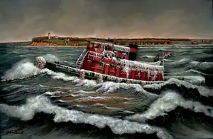 It is unknown what caused Captain Dickman to come about and head back into the Sound. Maybe he wished to follow the tanker and move in tandem to a safe haven. Perhaps the decision was based on a far more sinister condition. At the prevailing temperature of zero degrees, each wave that broke against the tug would have frozen solid along the sides of the tug. The ice would have accumulated inch by inch, crusting over the railings and then the pilothouse windows, until the tug's shape no longer was recognizable. Sometime within the course of 20 minutes, after the vessel started back out to the Sound, the crew realized they were in great peril. The tug, weighed down by the ice, and likely heeling to one side, would have become sluggish to respond her helm orders. The engineers would have been monitoring the conditions in the engine room, reporting their findings to the wheelhouse. Soon - the order was called to ready the lifeboat. The lights of Northport, so tantalizingly close, would suddenly appear very distant.