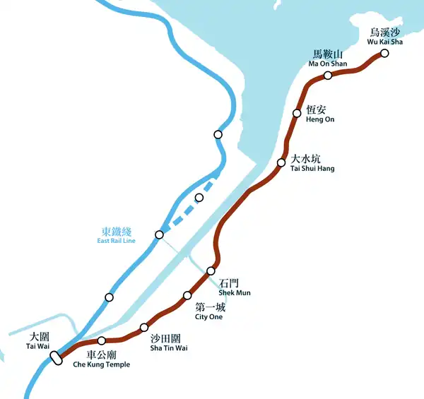 The Ma On Shan line (Chinese: 馬鞍山綫) was a rapid transit line that formed part of the Mass Transit Railway (MTR) system in Hong Kong. Coloured brown on the MTR map, the line acted as a branch of the East Rail line that connects the new towns of Sha Tin and Ma On Shan in the northeastern New Territories.