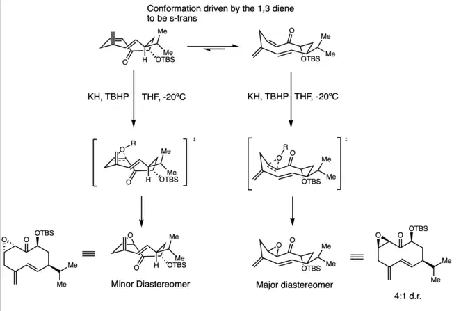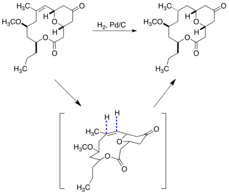 Reaction classes used in synthesis of natural products under the macrocyclic stereocontrol model for obtaining a desired stereochemistry include: hydrogenations such as in neopeltolide [7] and (±)-methynolide,[8] epoxidations such as in (±)-periplanone B[9] and lonomycin A,[10] hydroborations such as in 9-dihydroerythronolide B,[11] enolate alkylations such as in (±)-3-deoxyrosaranolide,[12] dihydroxylations such as in cladiell-11-ene-3,6,7-triol,[13] and reductions such as in eucannabinolide.[14]