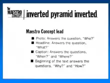 The Maestro concept is a time-management technique for story planning and newsroom organization through team collaboration to shape stories early before they are written. The central concept is trying to anticipate readers’ questions about news stories (“think like a reader”) and then answering those questions as quickly as possible through visual aspects with high-visibility points such as photos, headlines, captions and information graphics.[10] It is a management technique to encourage collaboration across news departments and ensure that quality work in a story package comes not from the traditional method of an assembly line, but from teamwork and good time-management from all players working on the story.