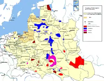 Magnates (or higher nobility) vied for political power with the lesser and middle nobility (Ruch egzekucyjny in the late 16th century, and the reform movement of the Great Sejm in the late 18th century) and the King.[1] To be counted among the magnates, one should have a large estate, and political influence at least on the scale of a province, if not national.[1] Regional differences abounded, with the estates being much larger in the east, where the wealthier magnates were also much more likely to have their own private armies.[1][2] The eastern territories were more independent from the central power, and the large estates there, known as latifundia, with private cities and armies of the magnates, gave rise there to the term królewięta ("little kings") used for the wealthiest of them - the developing aristocracy.[3][4] The magnates in the Royal Prussia had their fortunes build not around their own lands, but the royal grants (królewszczyzny).[1] The magnates tried to avoid splitting up of their lands, and some of the wealthiest families were able to protect their lands from division through the ordynacja system.[1] Magnate residences often became cultural and economic centers for a given region.[1]