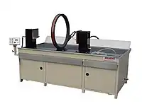 A wet horizontal MPI machine is the most commonly used mass-production inspection machine. The machine has a head and tail stock where the part is placed to magnetize it. In between the head and tail stock is typically an induction coil, which is used to change the orientation of the magnetic field by 90° from the head stock. Most of the equipment is built for a specific application.