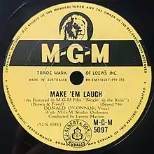"Make 'Em Laugh" is a song first featured in the 1952 MGM musical film Singin' in the Rain, performed by Donald O'Connor as the character Cosmo Brown. Written by Arthur Freed and Nacio Herb Brown,[1] the song is closely based on Cole Porter's "Be a Clown" from the Freed-produced 1948 MGM musical film The Pirate, in which it was sung by Gene Kelly and Judy Garland.[2][3] In the song, Cosmo explains that he loves making people laugh, and quotes back to the inspiring words of a man named Samuel J. Snodgrass (as he was about to be led to the guillotine), his dad and his grandpa (though it's made unclear whether Cosmo refers to Snodgrass's or his own relatives).