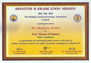 Mahtab is the chief investigator for the GBPD060 clinical study of the Bangladesh-developed SARS-CoV-2 mRNA candidate. He is also the lead researcher on NASVAC's Phase I/II and III clinical studies.[2] Mahtab was jointly awarded the ‘Premio Nacional'[3] from the Cuban Academy of Sciences for the discovery of NASVAC[4] in 2019. He organizes awareness-raising programs on liver diseases across the country in addition to inventing the NASVAC[4] drug aiming to offer an effective solution to Hepatitis B at an affordable price for mass people in Bangladesh.