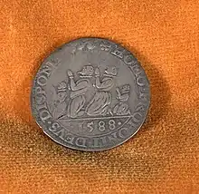 The phrase was also put on a Dutch commemorative medal celebrating the Elizabethan England Protestant victory in 1588 over the Catholic Spanish Armada.