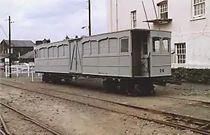 This was the third batch of motorcars delivered to the railway in 1895 at the same time as the cars for the new Snaefell Mountain Railway were delivery. They were constructed to a very similar design to those provided for the mountain line. These vehicles were not a success owing to their initially open side with no glazed windows and were subsequently converted for use as cattle cars, one of which survives today, numbered 26 (in sequence with good stock rather than power cars, as power car 26 is still extant). It is currently in store but was for several years part of a display at Ramsey Plaza station as part of a small museum. It is the sole survivor of the class, the remaining ones were also converted to cattle cars but decreased usage of the railway for such use meant that they were surplus to requirements and only one was retained to ensure that one of each type is retained.