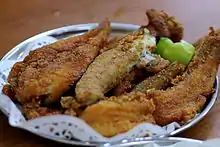 Seafood is a staple for many Konkan coastal communities and is popular in other parts of the state too.[53] Most of the recipes are based on marine fish, prawns and crab. A distinct Malvani cuisine of mainly seafood dishes is popular. Popular fish varieties include Bombay duck,[54] pomfret, bangda, Rawas, and surmai (kingfish). Seafood recipes are prepared in different ways such as curried, Pan frying, or steaming in banana leaves.[55]
