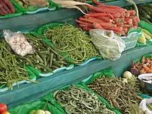 Until recently, canned or frozen food was not widely available in India. Therefore, the vegetables used in a meal widely depended on seasonal availability. In Maharashtra, spring (March–May) is the season of cabbages, onions, potatoes, okra, guar and tondali,[25] shevgyachya shenga, dudhi, marrow and padwal. During the Monsoon season (June–September) green leafy vegetables, such as aloo (Marathi: आळू), or gourds such as karle, dodka and eggplant become available. Chili peppers, carrots, tomatoes, cauliflower, French beans and peas become available in the cooler climate of October to February.[26] Coal fired roasted young cobs of Sorghum (Jwari) is a popular item during winter picnics to the farms.[27] Vegetables are typically used in making bhaajis (Indian stew). Some bhaajis are made with a single vegetable, while others are made with a combination. Bhaajis can be "dry" such as stir fry or "wet" as in the well-known curry. For example, fenugreek leaves can be used with mung dal or potatoes to make a dry bhhaji or mixed with besan flour and buttermilk to make a curry preparation.[28] Bhaaji requires the use of goda masala, consisting of a combination of onion, garlic, ginger, red chilli powder, green chillies, turmeric and mustard seeds.[29][30] Depending on a family's caste or specific religious tradition, onions and garlic may be excluded. For example, a number of Hindu communities from many parts of India refrain from eating onions and garlic altogether during chaturmas, which broadly equals the monsoon season.[31]