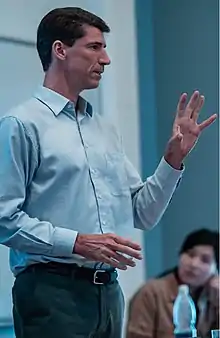 ![]() Tonelli giving a speech on the circular economy (Biškek, 2019) | |