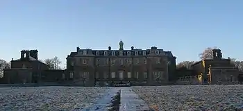 The family's prosperity in the late 17th century, brought about by the reward of loyalty to the Crown, made it possible for grand ideas of Marchmont House to be conceived. Thoughts of creating an impressive new family seat inspired Alexander, the second Earl, to draw up designs for the landscaping. He also commissioned William Adam[2] to draw up plans for the new house, however these were considered to be too expensive. Both the 2nd Earl and Adam died before the house was started. It was the 3rd Earl, succeeding in 1740, who became responsible for the execution of the new building. It is now understood that it was the lesser known architect Thomas Gibson[3] who designed the house and not Adam. However, the latter's influence was present in the architecture as well as garden design, as was that of the Palladian revival of Lord Burlington, a friend of the Earl of Marchmont. Marchmont's internal arrangement and elevations reflect those at Houghton Hall, Norfolk.[4] The second Earl's sister, Lady Grisell, married a Baillie from Mellerstain, where William Adam worked.