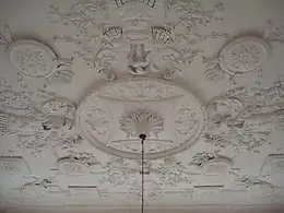 Internally the main staircase was removed and replaced by a two-story open internal hall surmounted by an oval cupola, and a new grander staircase was located to the right of the entrance beneath a dome. The dining room and library were swapped so that the latter now overlooks the front of the house. A grand double-storey music room, originally designed by Lorimer for Rowallan Castle,[4] was made out of the stable wing in the north pavilion. It is finely paneled in oak with delicate carving modeled by Louis Deuchars and carved by W. and A. Clow.[6] At the east end of the room is placed a fine full-size organ by Norman and Beard of Norwich, which is still maintained today. The grand music room, one of the focal points of the house, symbolizes McEwen's love of music. We are reminded again of this love for music and that for country sports by 20th-century plaster panels by Thomas Beattie decorating the second floor of the stairwell. An accomplished musician himself, McEwen set poems by Robert Burns and Sir Walter Scott to music.