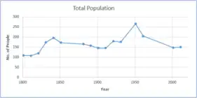 The population of the last two centuries (1801-2011) has shown a steady rise and subsequent fall of total population in Marholm. This trend is also true in within both the 19th and 20th centuries. In 1801 the population of Marholm was recorded to be 109, by 1851 this figure had risen to 172 only to have fallen back down to 146 by 1901. The trend continues in the 20th century. Between 1901 and 1951 Marholm saw its biggest increase in population during any period in the last two centuries with the population peaking at its highest with 266,[11] however fast forward 60 years to 2011 the population has reverted almost to levels recorded in 1901 with 151 people counted.[12]