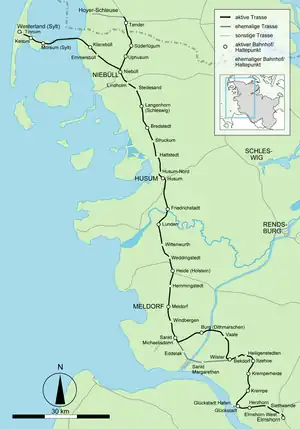The Marsh Railway (German: Marschbahn) is a main line in the state of Schleswig-Holstein in Germany that links the stations of Elmshorn in the south and Westerland on the island of Sylt in the north. It is part of 237 km (147 mi) long route from Hamburg-Altona to Westerland (Sylt) and is listed in the Deutsche Bahn timetables as Kursbuchstrecke 130. The first part of it was opened in 1845 and is one of the oldest lines in Germany.