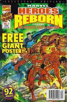 Marvel Heroes Reborn was a British comic book series which was a part of the Marvel UK's 'Collector's Edition' line. It was published by Panini Comics and reprinted Marvel Comics from the United States. The title printed Fantastic Four, Iron Man, the Hulk, and before the series ended Avengers comics. This line began in September 1997, after Panini Comics had successfully published Astonishing Spider-Man, Essential X-Men and Wolverine Unleashed (now Wolverine and Deadpool). The series ended in 2000 at #42, due to an "overcrowded market". The comic was initially priced at £1.99 when it was released, but over the years rose to £2.30. A year later Avengers United took its place on the shelves.