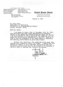 Koss defined the unacknowledged rape victims as women who have experienced the behaviors that define rape (oral, anal, or vaginal penetration against consent through force, bodily harm, or when incapacitated and unable to consent) but do not realize that their experience constitutes rape or chose not to view it that way.[4] This is now a well-accepted finding reaffirmed by other investigators in national surveys repeated in the early 2000s and most recently reported in 2012. Koss has served as an invited speaker and guest lecturer around the world. In 1991, she testified as an expert witness at the U.S. Senate hearings that led to the first passage of Violence Against Women Act. Koss has since conducted multiple legislative testimonies, including expert witness testimonies to the U.S. Senate Veteran's Affairs Committee, U.S. News & World Report, Senator Cory Brooker on restorative justice, and US Advisory Commission on Child Abuse. Other legal testimony from Koss includes working with Congressional Briefing on Violence Against Women, and the Legislative Policy Brief released by the Evelyn Jacobs Ortner Center on Family Violence.