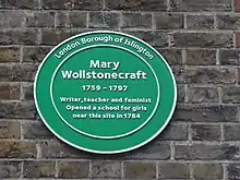 Gradually, Wollstonecraft returned to her literary life, becoming involved with Joseph Johnson's circle again, in particular with Mary Hays, Elizabeth Inchbald, and Sarah Siddons through William Godwin. Godwin and Wollstonecraft's unique courtship began slowly, but it eventually became a passionate love affair.[62] Godwin had read her Letters Written in Sweden, Norway, and Denmark and later wrote that "If ever there was a book calculated to make a man in love with its author, this appears to me to be the book. She speaks of her sorrows, in a way that fills us with melancholy, and dissolves us in tenderness, at the same time that she displays a genius which commands all our admiration."[63] Once Wollstonecraft became pregnant, they decided to marry so that their child would be legitimate. Their marriage revealed the fact that Wollstonecraft had never been married to Imlay, and as a result she and Godwin lost many friends. Godwin was further criticised because he had advocated the abolition of marriage in his philosophical treatise Political Justice.[64] After their marriage on 29 March 1797, Godwin and Wollstonecraft moved to 29 The Polygon, Somers Town. Godwin rented an apartment 20 doors away at 17 Evesham Buildings in Chalton Street as a study, so that they could both still retain their independence; they often communicated by letter.[65][66] By all accounts, theirs was a happy and stable, though brief, relationship.[67]