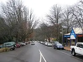 The city was established as a stopping point on the Yarra Track, the route to the Woods Point and Upper Goulburn goldfields, with a butcher's shop and store in existence by the time the town was surveyed in 1864.[6] It prospered following the reconstruction of the Yarra Track as an all weather dray and coach road under engineer Clement Wilks in the 1870s. It was named after Mary Steavenson, the wife of Assistant Commissioner of Roads and Bridges John Steavenson after whom the popular Steavenson Falls are named. The Marysville Post Office opened on 1 March 1865 followed by a school in 1870, and a public hall, library and mechanics institute in 1890.[6] By the 1920s, Marysville had become a tourist destination, with the Marysville Tourist and Progress Association formed in 1924.[6][7] Attractions promoted at the time were fern gullies, views, and walking tracks to Steavenson Falls.[6] Twelve guest houses had been established by 1920, one of the best known of these being the Cumberland Guest House.[6] At this time a rail service operated between Melbourne and nearby Healesville,[6] and the town became a popular destination for couples on their honeymoon.[8]