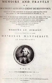 Count Maurice Benyovszky de Benyó et Urbanó (Hungarian: Benyovszky Máté Móric Mihály Ferenc Szerafin Ágost; Polish: Maurycy Beniowski; Slovak: Móric Beňovský; 20 September 1746 – 24 May 1786)[1] was a renowned military officer, adventurer, and writer from the Kingdom of Hungary, who described himself as both a Hungarian and a Pole.[2] He is considered a national hero in Hungary, Poland, and Slovakia.