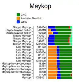 Admixture analysis of various Maykop Culture populations: mainly combinations of Anatolian Neolithic (AN), Western Hunter-Gatherer (WHG) and Caucasus Hunter-Gatherer (CHG).[11]