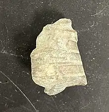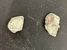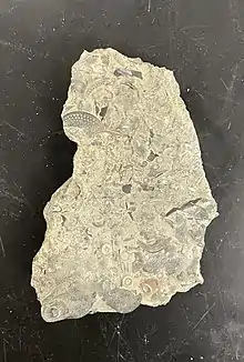 This formation is the least accessible of the three formations at Maysville, requiring one to hike up a steep trail located near the South end of the roadcut. It is important to be cautious while hiking the trail to Bellevue as ticks and poison ivy are prevalent in the forested areas. North America was underwater during the Ordovician period therefore the Bellevue formation was formed from shallow water deposits, consisting mostly of shale.[2] Within the layers of shale, brachiopod fragments are prevalent, and commonly vinlandostrophia are found. The Bellevue formation contains many small crinoid stems due to the deposits that came from the shallow water in the most recent years of the Ordovician period. The base of the Bellevue formation contains a large collection of echinoderms.[3] Crinoids are a part of the echinoderm phylum. The Bellevue formation also comprises larger fragments of bryozoa as well as vinlandostrophia in comparison to the Fairview and Kope formations.[2] Visitors can find a majority of these fossils in the lower and base part of the Bellevue formation. The top of Bellevue along with parts of the base are difficult to access and potentially dangerous.