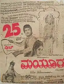 Mayura is a 1975 Indian Kannada-language historical drama film, directed by Vijay.[2] It is one of the most popular films of acclaimed Kannada actor Rajkumar, who plays the role of Prince Mayurasharma of the Kadamba dynasty, the earliest native kingdom to rule over what is today the modern state of Karnataka. The film depicts the life of Mayura, a Brahmin youth, as he discovers his royal heritage and realizes his destiny of ascending to the throne of the then-Pallava kingdom.