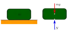 An object resting on a surface and the corresponding free body diagram showing the forces acting on the object. The normal force N is equal, opposite, and collinear to the gravitational force mg so the net force and moment is zero. Consequently, the object is in a state of static mechanical equilibrium.