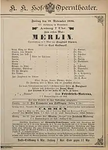 Merlin is a German-language opera by Karl Goldmark to a libretto by Siegfried Lipiner. It had its premiere at the Wiener Hofoper on November 19, 1886. The Metropolitan Opera gave the American premiere with Lilli Lehmann[1] under Walter Damrosch on January 3, 1887.[2]