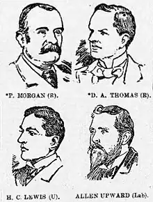 Richard and Fothergill were re-elected in 1874. By 1879, however, Fothergill was in financial difficulties and there were calls for him to step aside. A deputation of tradesmen and working men who attended a meeting at Swansea to request to offer himself once again as a candidate but he eventually declined.[7] He was replaced by Charles Herbert James. member of a long-standing politically active family in Merthyr. Both served until 1888 when Richard died and James stood down, leading to two by-elections within a twelve-month period. These led to the return of David Alfred Thomas and William Pritchard Morgan. Thomas and Morgan had much in common. Both were nonconformists, both were wealthy industrialists and both placed Welsh issues high on their list of political priorities. However, they also shared 'a hearty loathing' for each other.[8]