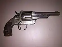 1st Model – The first model is single-action, identified by its "open top" design (no top strap over the cylinder), "scoop" flutes on the cylinder, and a barrel wedge to engage the enclosed cylinder pin. Standard barrel was 7 inches, including an integral front sight. Most were manufactured with hard rubber grips—though wood, pearl or ivory could be had for additional cost. The first caliber offered was the proprietary .44 Merwin & Hulbert (.44-30), which resembles the S&W .44 American, but is longer overall. Eyeing the lucrative contracts the Smith & Wesson enjoyed with Imperial Russia, this model was later produced in .44 Russian.[4] Production began in 1876, and likely ended in or around 1878 with the introduction of the 2nd model.