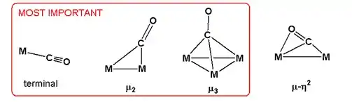 The carbonyl ligand engages in a wide range of bonding modes in metal carbonyl dimers and clusters. In the most common bridging mode, denoted μ2 or simply μ, the CO ligand bridges a pair of metals. This bonding mode is observed in the commonly available metal carbonyls: Co2(CO)8, Fe2(CO)9, Fe3(CO)12, and Co4(CO)12.[1][4] In certain higher nuclearity clusters, CO bridges between three or even four metals. These ligands are denoted μ3-CO and μ4-CO. Less common are bonding modes in which both C and O bond to the metal, such as μ3η2.