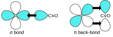 Carbon monoxide bonds to transition metals using "synergistic pi* back-bonding". The M-C bonding has three components, giving rise to a partial triple bond. A sigma (σ) bond arises from overlap of the nonbonding (or weakly anti-bonding) sp-hybridized electron pair on carbon with a blend of d-, s-, and p-orbitals on the metal. A pair of pi (π) bonds arises from overlap of filled d-orbitals on the metal with a pair of π*-antibonding orbitals projecting from the carbon atom of the CO. The latter kind of binding requires that the metal have d-electrons, and that the metal is in a relatively low oxidation state (0 or +1) which makes the back-donation of electron density favorable. As electrons from the metal fill the π-antibonding orbital of CO, they weaken the carbon–oxygen bond compared with free carbon monoxide, while the metal–carbon bond is strengthened. Because of the multiple bond character of the M–CO linkage, the distance between the metal and carbon atom is relatively short, often less than 1.8 Å, about 0.2 Å shorter than a metal–alkyl bond. The M-CO and MC-O distance are sensitive to other ligands on the metal. Illustrative of these effects are the following data for Mo-C and C-O distances in Mo(CO)6 and Mo(CO)3(4-methylpyridine)3: 2.06 vs 1.90 and 1.11 vs 1.18 Å.[5]
