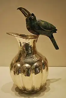 Metalworking in Mesoamerica, especially of silver, gold and copper, was highly advanced when the Spanish arrived. Gold was inlaid into copper and metals were hammered to paper thinness and cast using the lost wax method. Some copper and iron tools were produced, but pre-Hispanic metal craft was dominated by jewelry and ornaments. The Spanish introduced new techniques such as filigree work, where tiny threads of metal are strung together to make jewelry.[31] During the colonial period, indigenous peoples were forbidden to work with precious metals. Today, ancient designs have been revived with Taxco being the center of silversmithing. Silverwork is now one of Mexico's major exports.[32] Copper work is particularly abundant in Michoacán. A traditional hammered copper object is a large vessel in which pork fat is rendered or sugar caramelized for making candies. Every year during the month of August Santa Clara del Cobre holds a copper festival.[33]