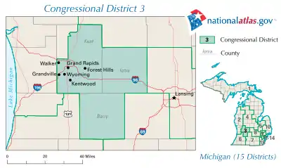 Michigan's 3rd congressional district is a U.S. congressional district in West Michigan. From 2003 to 2013, it consisted of the counties of Barry and Ionia, as well as all except the northwestern portion of Kent, including the city of Grand Rapids. In 2012 redistricting, the district was extended to Battle Creek. In 2022, the district was condensed to the greater Grand Rapids and Muskegon areas, including portions of Kent, Muskegon, and Ottawa counties. Redistricting removed Barry, Calhoun, and Ionia counties.[5]