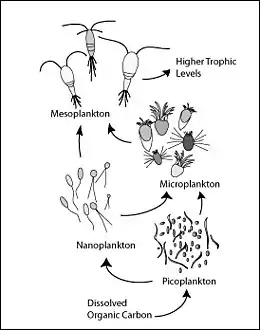 In general, dissolved organic carbon (DOC) is introduced into the ocean environment from bacterial lysis, the leakage or exudation of fixed carbon from phytoplankton (e.g., mucilaginous exopolymer from diatoms), sudden cell senescence, sloppy feeding by zooplankton, the excretion of waste products by aquatic animals, or the breakdown or dissolution of organic particles from terrestrial plants and soils.[2] Bacteria in the microbial loop decompose this particulate detritus to utilize this energy-rich matter for growth. Since more than 95% of organic matter in marine ecosystems consists of polymeric, high molecular weight (HMW) compounds (e.g., protein, polysaccharides, lipids), only a small portion of total dissolved organic matter (DOM) is readily utilizable to most marine organisms at higher trophic levels. This means that dissolved organic carbon is not available directly to most marine organisms; marine bacteria introduce this organic carbon into the food web, resulting in additional energy becoming available to higher trophic levels. Recently the term "microbial food web" has been substituted for the term "microbial loop".